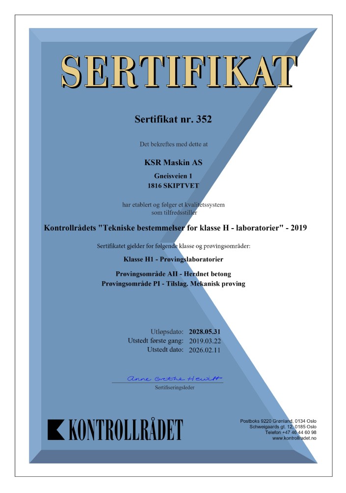 KSR Maskin AS har ett laboratorium som är specialiserat på kvalitetssäkring och analyser inom sand-, sten- och krossproduktion. Laboratoriet är certifierat av norska Kontrollrådet som ett ballastlaboratorium i klass PI och AII.